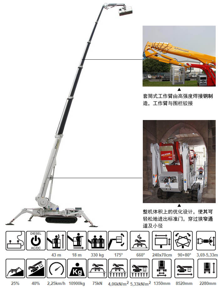 · XTJ43蜘蛛式升降機窄而緊湊,無論是駕駛和安裝,它都可以在任何高度,從- 4到+ 43米,簡單而直接的運動,零尾擺。