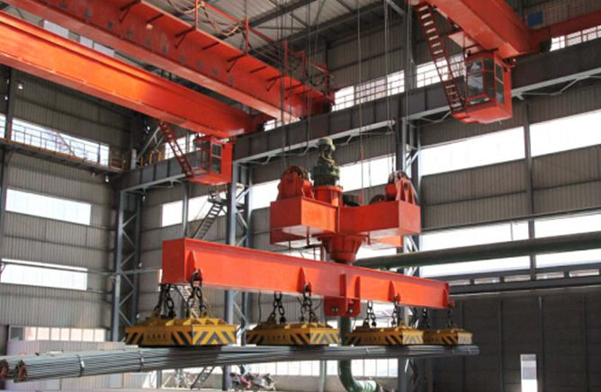 QA型電磁吊鉤橋式起重機(jī)是一種配有電磁吸盤的吊鉤橋式起重機(jī),由橋架、小車(裝有起升機(jī)構(gòu)和運(yùn)行機(jī)構(gòu))、起重機(jī)運(yùn)行機(jī)構(gòu)、電氣設(shè)備、電磁吸盤系統(tǒng)(電磁雙梁)、旋轉(zhuǎn)機(jī)構(gòu)(電磁雙梁)五大部分組成。它是一種利用電磁原理搬運(yùn)鋼鐵物品的機(jī)器,帶有可裝卸的電磁盤,特別適用于冶金工廠在室內(nèi)或露天場合較繁重的裝卸及搬運(yùn)具有磁性的金屬制品與材料。